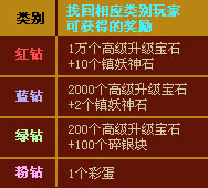 按照被找回玩家的类别不同,可获得的奖励不同,最高可获得1万个高级升级宝石和10个。
