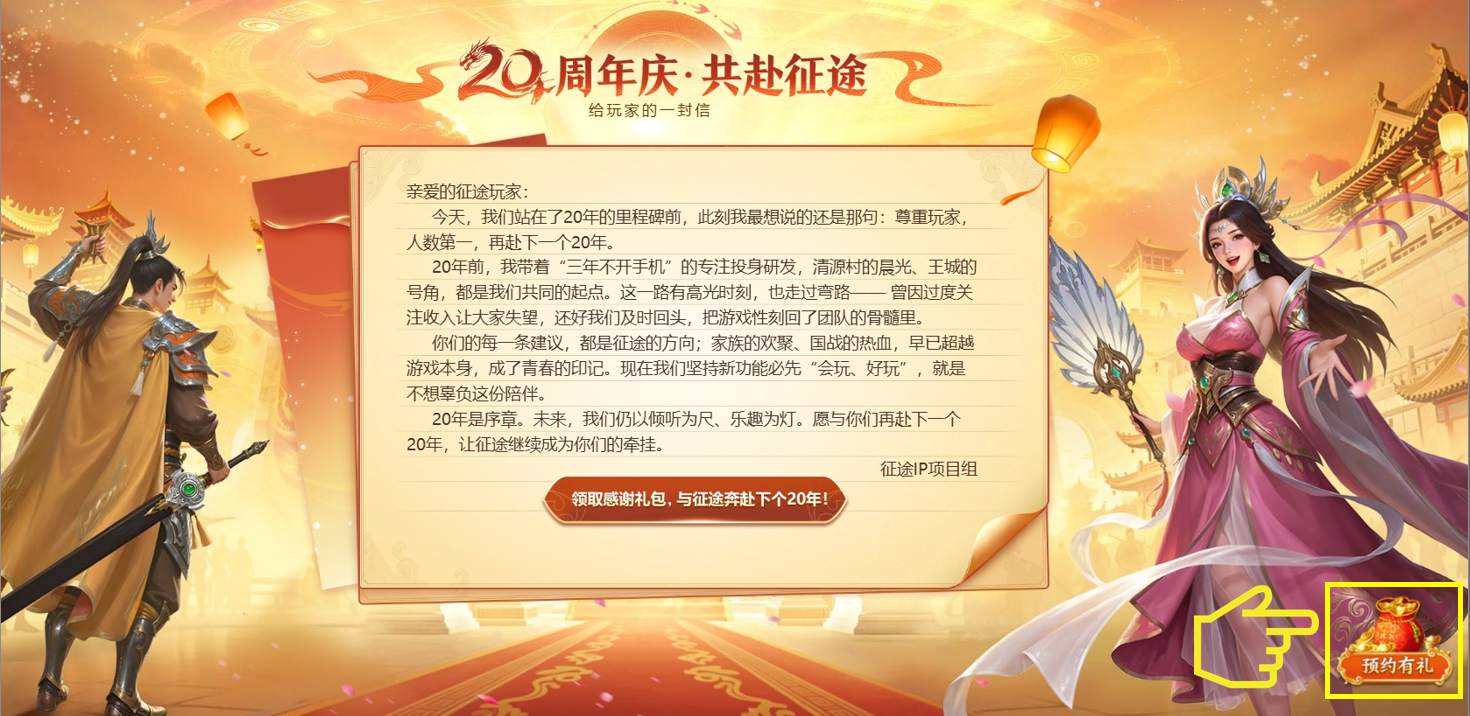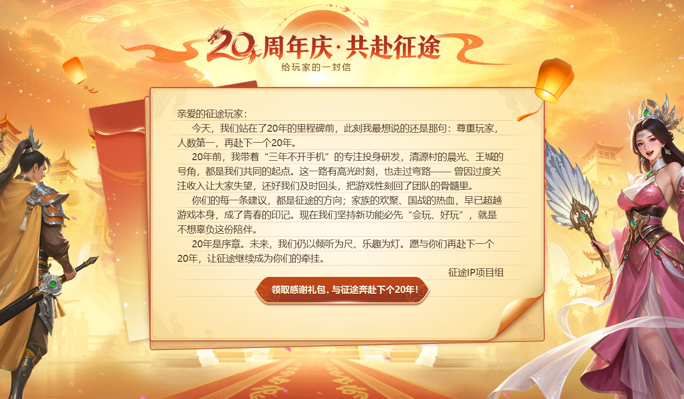 ■共赴征途:阅读20周年庆致玩家的感谢信,领取周年感谢礼包,与征途携手奔赴下一个20年。