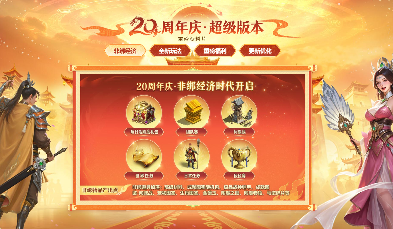 ■超级版本:进入版块查看《征途怀旧版》周年庆福利与玩法——非绑经济赚翻天,团队赛、问鼎战、世界任务、每日活跃度礼包新增非绑奖励。和氏璧深度策略养成,开启词条打造之旅!