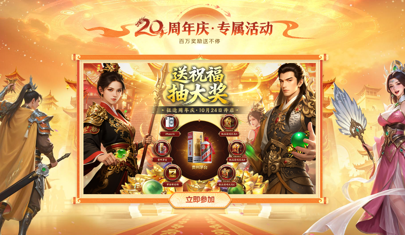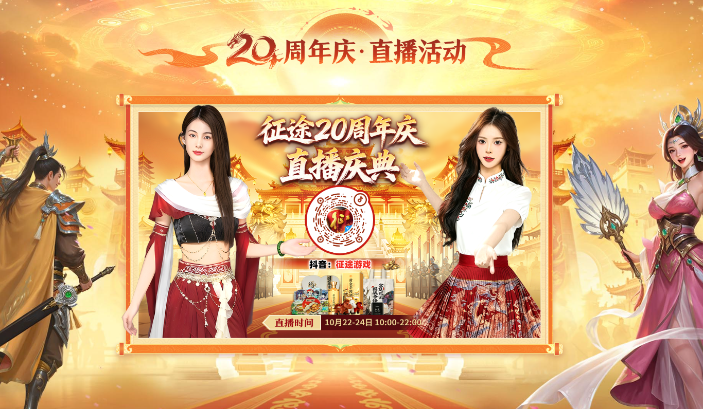 跨越20载热血征程,征途全系20周年庆典即将于10月24日全面上线!今日周年庆专题页上线,点击下方链接,查看“感谢信、新区、版本、短剧、活动、直播、线下庆典、非遗联动”精彩内容,共赴20年之约!
