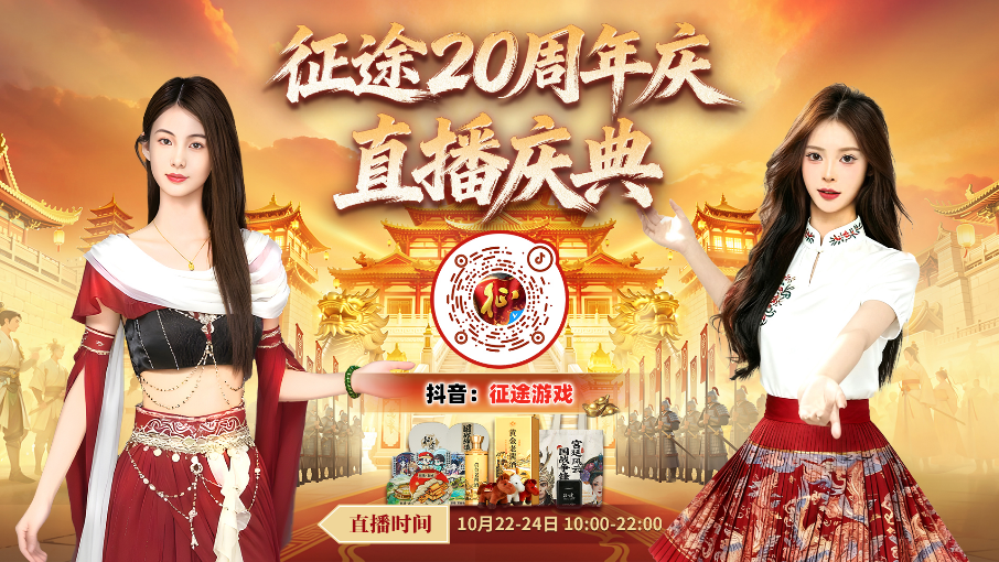 10月22日~10月24日,连续三天,每天10:00-22:00,美女主播与你相约抖音“征途游戏”官方直播间,海量实物周边、多轮口令礼包全程派发,与你一起重温热血,见证征途20周年荣耀时刻!