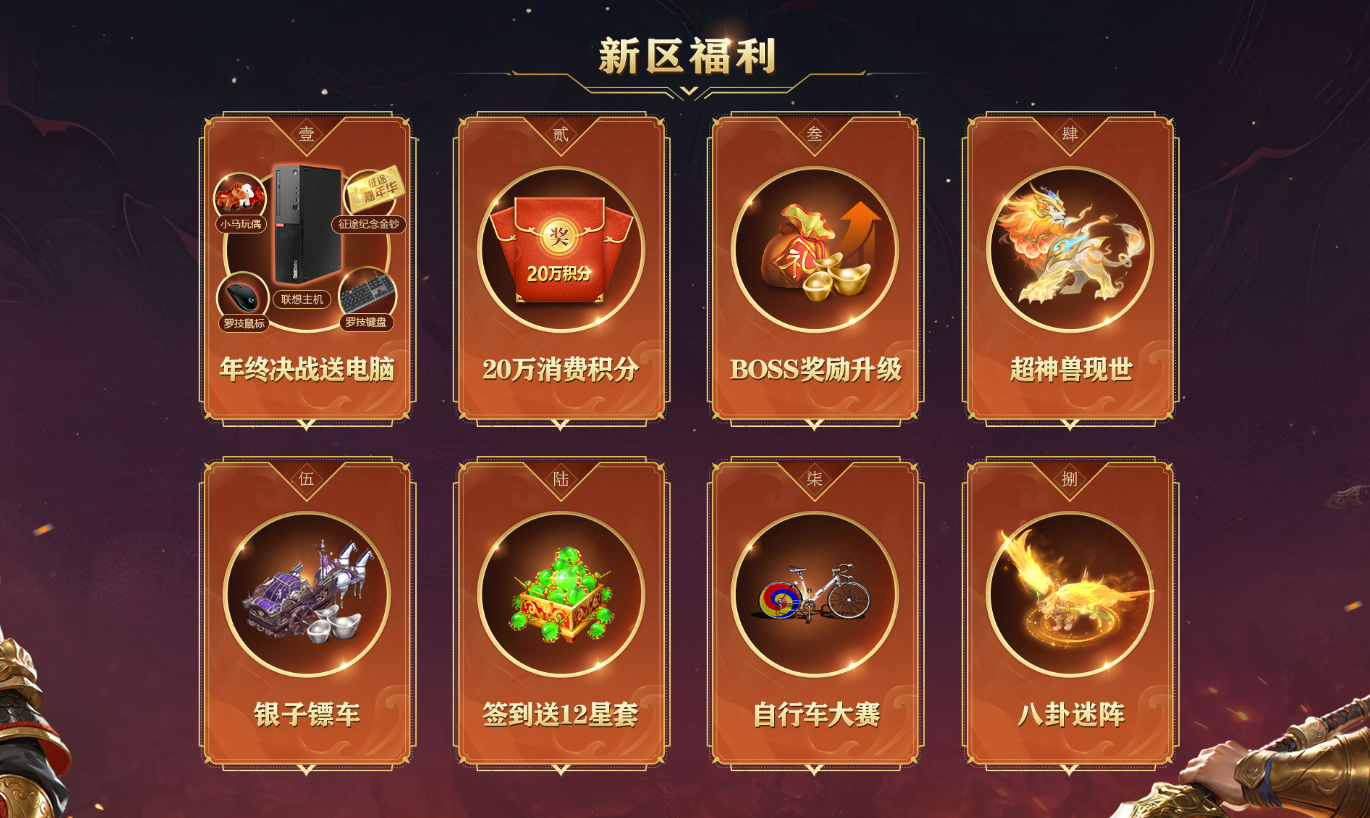 ■新区福利:年度大区“年终决战”今日开启,抢联想电脑、罗技外设、纪念金钞!打BOSS爆非绑,拍卖赚大钱!超神兽现世,属性提升特效炸场。现在入驻,领20万消费积分,签到再送全套12星!