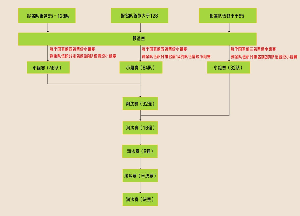 ■报名队伍>128支:每个国家前5名的队伍晋级小组赛,剩余名额由积分排名前14的队伍晋级小组赛,共计64支队伍。