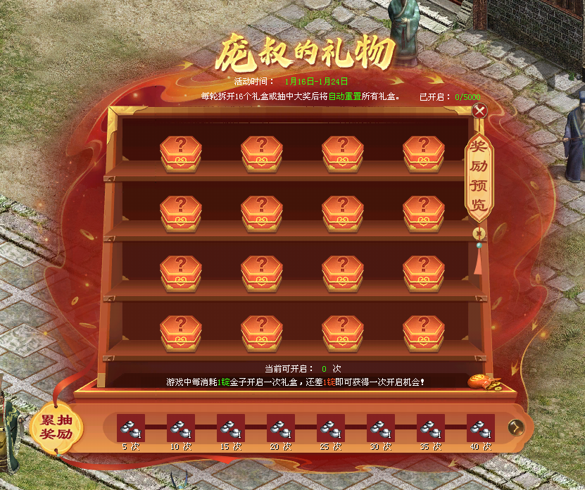 活动期间,玩家每累计消耗1锭金子,就可获得1次礼盒的开启机会。玩家可选择任一未开启的礼盒,并消耗1次开启机会,来获得该礼盒中的道具奖励。