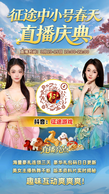 中小号春天版本剧透预警!征途中小号春天直播盛典3.13火热开播,精美周边连送3天,天降巨富,春日赠礼!即刻扫码关注抖音“征途游戏”官方直播间,美女主播团舞惊喜不断,精美周边日日领,趣味小游戏实时弹幕互动!提前关注账号预约直播,抢马上暴富礼盒、定制周边等海量豪礼!