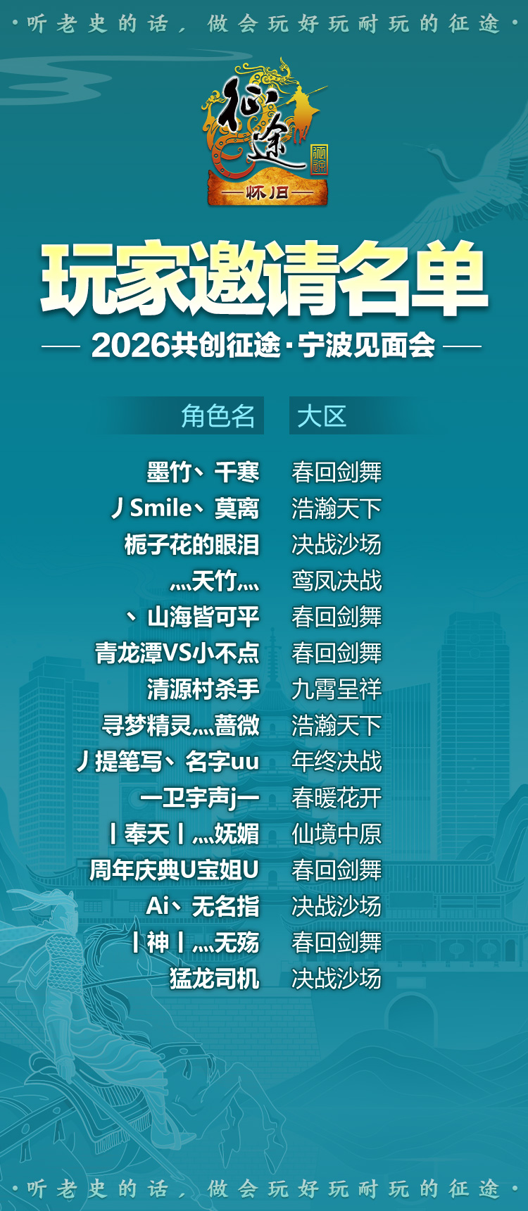宁波站作为2026征途系列全国巡回玩家见面会的重要一站,承载着征途与玩家深化共创、携手前行的美好期许。4月11日,我们在宁波恭候各位玩家的到来,大家的真知灼见,将是征途不断优化、持续焕新的核心动力,一人赴会全族同享,让我们一起共创更精彩的征途世界!