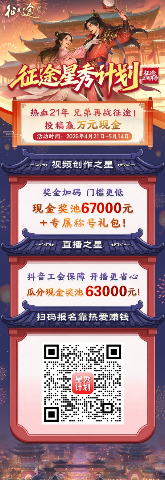 4月21日-5月14日,征途IP公测21周年庆“星秀计划”邀请热爱创作、热爱分享的你,讲征途故事,赢万元现金。