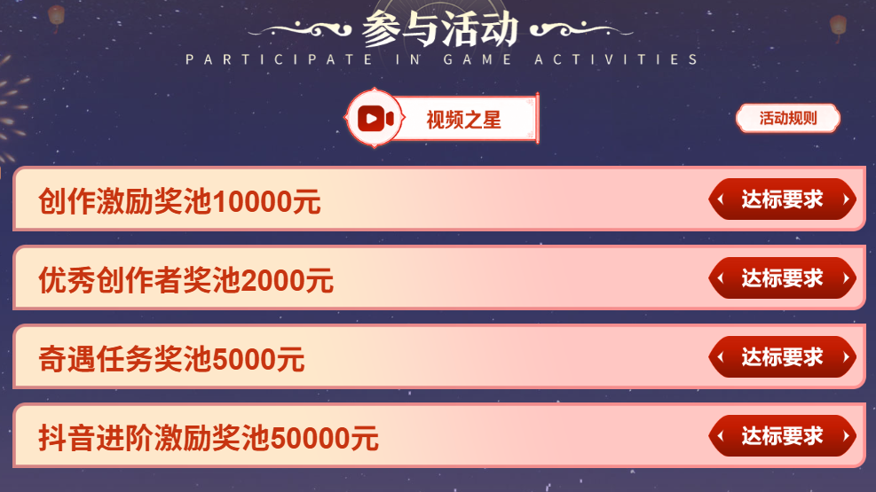 按要求制作指定数量、带活动话题的征途相关视频,或达成开播天数要求,即可瓜分现金奖池,优秀创作者还将获得额外奖金。官方将通过“星秀计划”企业微信不定时发布奇遇创作任务,参与可额外瓜分奇遇任务奖池!